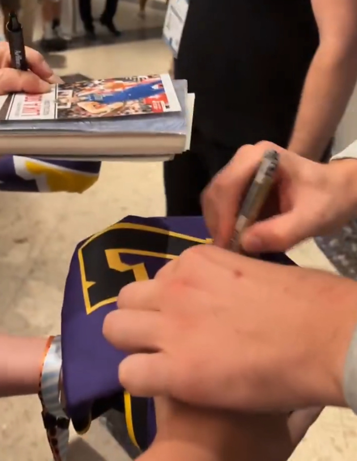 东契奇的确是一个暖心的偶像,遇见年龄较小的球迷他是有求必应,在湖人球员上签名,在手机上签名,在海报、画册上签名,东契奇在斯洛文尼亚算是全民偶像,减重后的他颜粉也不少。